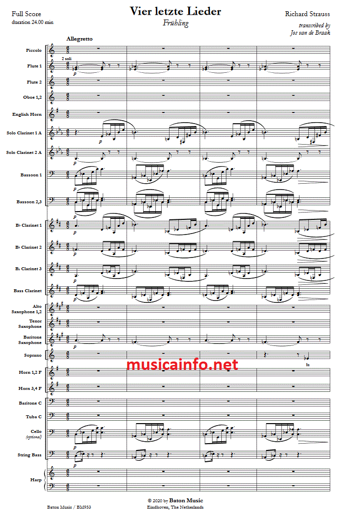 Dutch arranger Jos van de Braak transcribed the 'Vier letzte Lieder' for Soprano with accompaniment of a Symphonic Band.