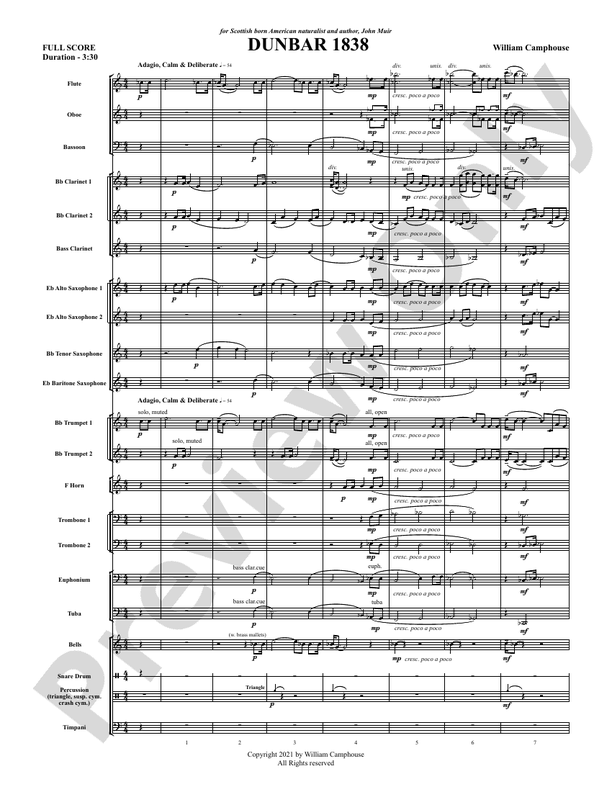Zusatzinfo/Inhalt Dunbar 1838 ist das Geburtsjahr und der Geburtsort von John Muir: Naturforscher, Autor und „Vater der US-Nationalparks“. Muir ist gebürtiger Schotte, in seinen Teenagerjahren und im frühen Erwachsenenalter Einwanderer aus dem Mittleren Westen und den Großteil seines Lebens Kalifornier. Muir begab sich auf eine Reise, die er selbst als lebenslangen Studenten bezeichnete und an der „Universität der Wildnis“ studierte. Seine Liebe und sein Einsatz für die Erhaltung einer unberührten Natur sind legendär. Er wurde oft mit den Worten zitiert: „Wenn wir versuchen, etwas für sich allein zu betrachten, stellen wir fest, dass es mit allem anderen im Universum verbunden ist.“ Ebenso ist diese Musik von William Camphouse eine einfache Ballade, die weitgehend auf der pentatonischen Tonleiter und der Verwendung eines „Scotch Snap“-Rhythmusmusters (Sechzehntel/punktierte Achtel) basiert und einer traditionellen schottischen Volksmelodie ähnelt, und eine Anspielung auf Muirs Erbe und Lebenseinstellung. Sie soll von allen Musikern in jedem zugewiesenen Teil in einem fließenden, anhaltenden Stil und mit viel Energie vorgetragen werden; Sorgfalt und Kontrolle; Genauigkeit; Aufmerksamkeit für Dynamik und Phrasierung; und volle, reiche Tonqualität. Alle diese Elemente zusammen ergeben großartige Musik für Musiker und Publikum gleichermaßen!
