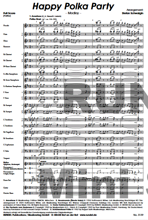 Zusatzinfo/Inhalt Die Formel „Happy Polka“ wurde von dem legendären Bandleader James Last geprägt: bekannte, traditionelle Polka-Melodien, unterlegt von einem Beat-Groove, arrangiert im Big-Band-Sound mit Dominanz der Blechbläser. Seit Jahrzehnten lebt dieses Erfolgsrezept in Adaptionen für diverse Besetzungen fort und animiert Alt und Jung stets erneut zum Mitklatschen und -singen. Mit seiner neuen „Happy Polka Party“ legt Stefan Schwalgin ein modernes und zeitgemäßes Arrangement in diesem Genre vor. Fünf absolute „Renner“ der volkstümlichen Musik garantieren in diesem Medley einen Volltreffer bei jedem Publikum. Ideenreich und musikalisch ausgereift, verbleibt das Niveau der Blasorchester-Bearbeitung im mittleren Schwierigkeitsbereich und vermittelt so den Musikern die gleiche Freude wie den Zuhörern. Ob im Konzertsaal oder im Festzelt: die „Happy Polka Party“ sollte ab jetzt in keinem Programm mehr fehlen!