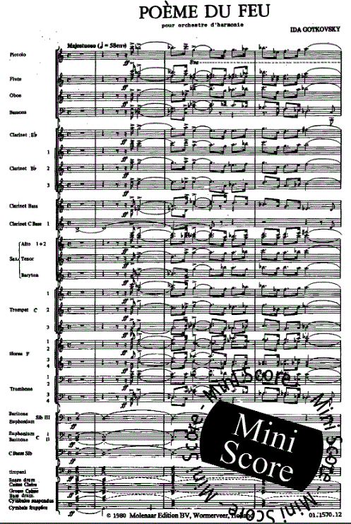 Zusatzinfo/Inhalt Major Albert Fasce, Leiter der Musikabteilung der französischen Armee, schrieb über Poème du Feu: Das Poème du Feu von Madame Ida Gotkovski ist wahrscheinlich eine der Originalkompositionen für Symphonieorchester, die in den letzten Jahren am erfolgreichsten war. Ich musste dieses Werk bei Konzerten mit verschiedenen Orchestern dirigieren, insbesondere in Budapest, und jede Aufführung wurde mit begeistertem Applaus begrüßt. Darüber hinaus ist es in der zeitgenössischen Musik recht selten, gleichzeitig die Zufriedenheit der Musiker und den Erfolg beim Publikum zu erreichen. Das ist bedeutsam. Dieses großartige Werk ist hervorragend für Blasinstrumente geschrieben. Es gibt keine größeren technischen Schwierigkeiten, aber der Charakter dieses Werks erfordert eine sorgfältige Platzierung und einen gewissen orchestralen Glanz. Im ersten Satz findet sich eine „Tonart“, die in gewisser Weise die rhythmische Entstehung des Werks darstellt. Die Metronombezeichnung des ersten Satzes sollte unbedingt eingehalten werden, und eine korrekte Interpretation der Akzente und Artikulationen ist unerlässlich. Die Fortissimi und Rallentandi sollten nicht übertrieben werden. Was den kleinen „Trick“ betrifft, so liegt dieser in der Ausführung der Stäbchen, die auf zwei Arten betrachtet werden sollten: die erste ist eine rhythmische für diejenigen, die aus der rhythmischen Entstehung entstehen, und die zweite ist eher melodisch für diejenigen, die in Passagen entstehen. Um schließlich den rhythmischen Ursprung der Stäbchen zu entschlüsseln, muss man rekurrierend vorgehen, beginnend mit den vier Stäbchen des Finales. Diese vier Stäbchen müssen in den verschiedenen Takten sehr rhythmisch ausgeführt werden. Für den ersten ergeben sie sich: 1: aus dem zweiten Takt des ersten Satzes 2: aus dem Takt drei Takte vor A für den zweiten 3: aus dem Takt von G bis zum vierten Takt für den dritten. Diese Stäbchen müssen rhythmisch gespielt werden, wobei jedoch jene drei Takte vor A abgeschwächt werden müssen. All dies ist von großer Bedeutung, da sonst die gesamte Ausführung im Widerspruch zum Geist und zur rhythmischen Inspiration des Werks steht. Außerdem könnte dieses schöne Werk sehr gut ein Ballett stützen. Als Leiter der Rundfunkmusik muss ich Madame Gotkovski unseren tiefsten Dank für ihren Beitrag zur Zusammenstellung eines echten Repertoires für Bläserensembles aussprechen. Dieses einzigartige und manchmal unterschätzte Orchester verfügt über ungeahnte Reichtümer. Dieses großartige Werk ist jetzt im Repertoire der Musique de l‘Air de France.